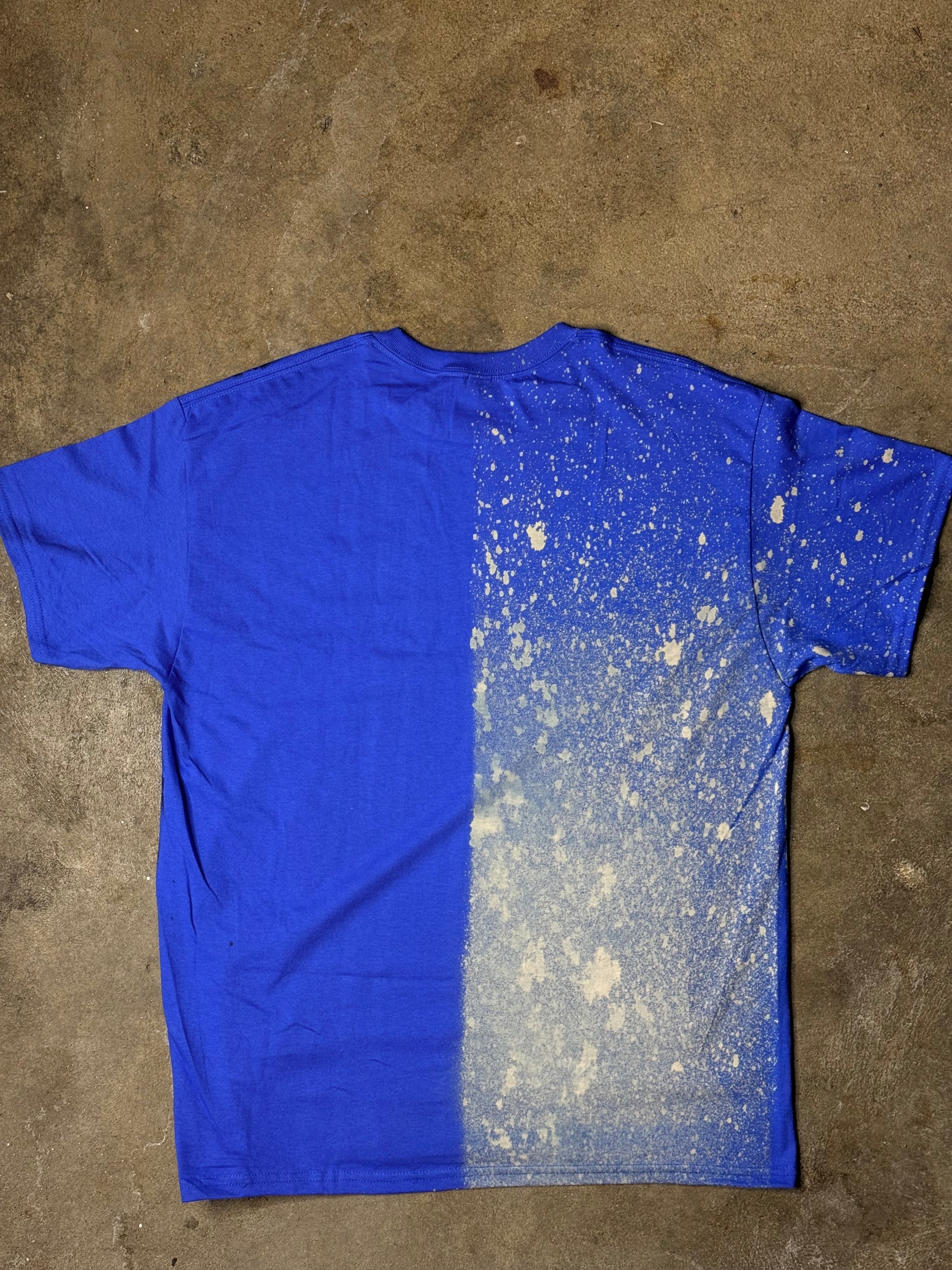 The RNBA Split Chain Tee is a hand-made royal blue tee featuring a split bleach fade and chain detail artwork. Each piece is one-of-one and made to order.